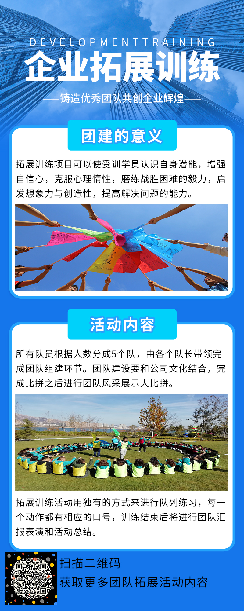 现在越来越多的企业单位组织员工开展拓展培训活动,目的是锻炼团队,提高团队凝聚力,使团队充满活力,具有更强的综合竞争力,从而在竞争中立于不败之地。市场。